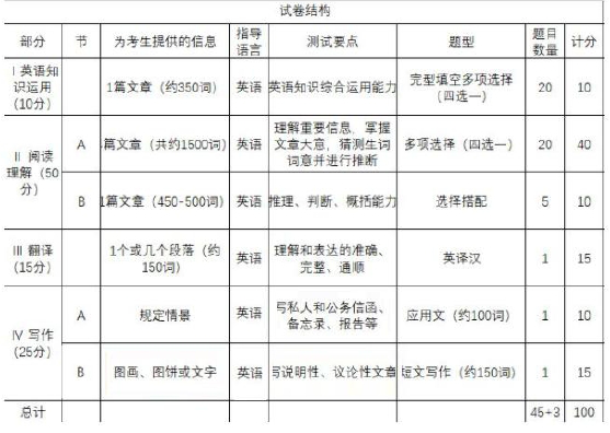 試題分四部分,共 48 題,包括英語(yǔ)知識(shí)運(yùn)用、閱讀理解、英譯漢和寫作。