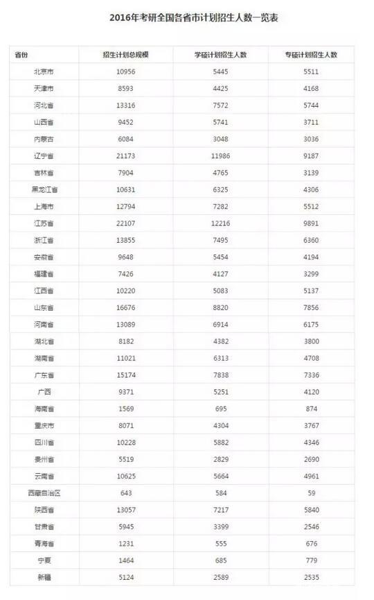 附: 2016年考研全國各省市計(jì)劃招生人數(shù)一覽表