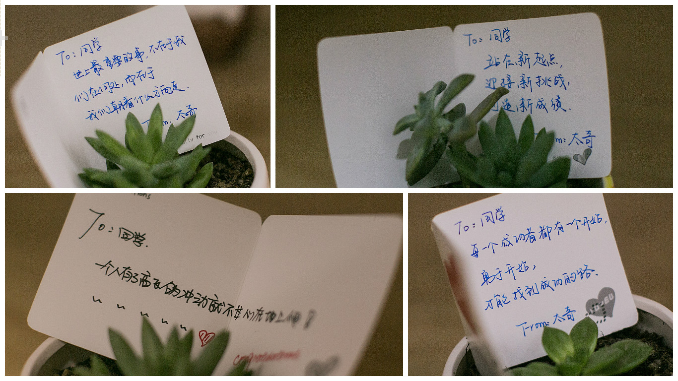 細(xì)心的同學(xué)們可能看到還沒有搬進(jìn)學(xué)員的空宿舍里桌子上都擺著一盆小多肉,這其實是我們隨“床”贈送的小禮物,走近看更是有手寫卡片放在上面,滿滿的期望和愛意,太奇人小到細(xì)節(jié)的關(guān)心著學(xué)員的學(xué)習(xí)和生活。