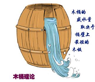 該理論由美國(guó)管理學(xué)家彼得提出:盛水的木桶是由許多塊木板箍成的,盛水量也是由這些木板共同決定的。若其中一塊木板很短,則盛水量就被短板所限制。這塊短板就成了木桶盛水量的“限制因素”。