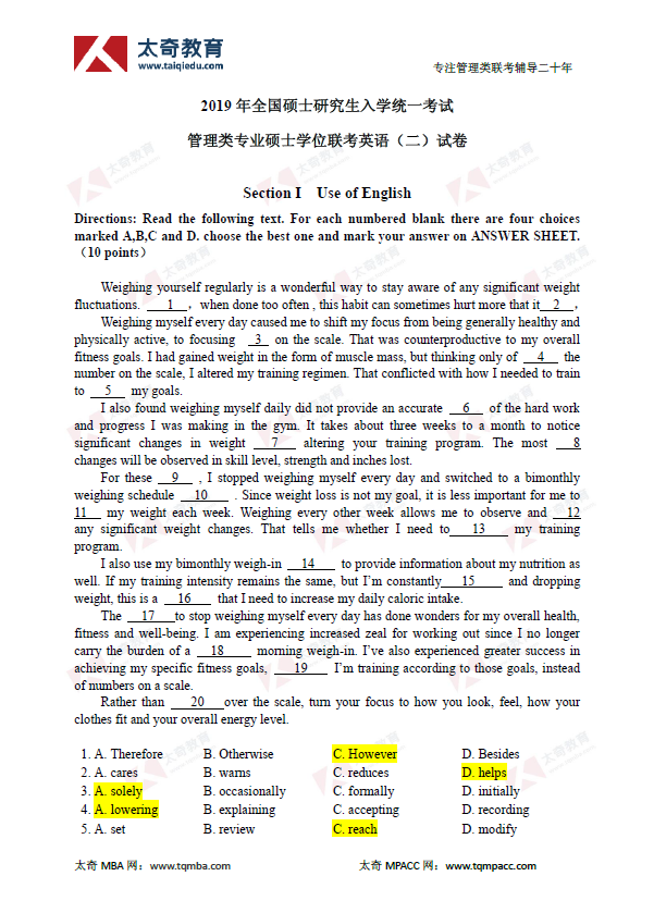 2019年管理類(lèi)聯(lián)考MBA英語(yǔ)二真題及參考答案
