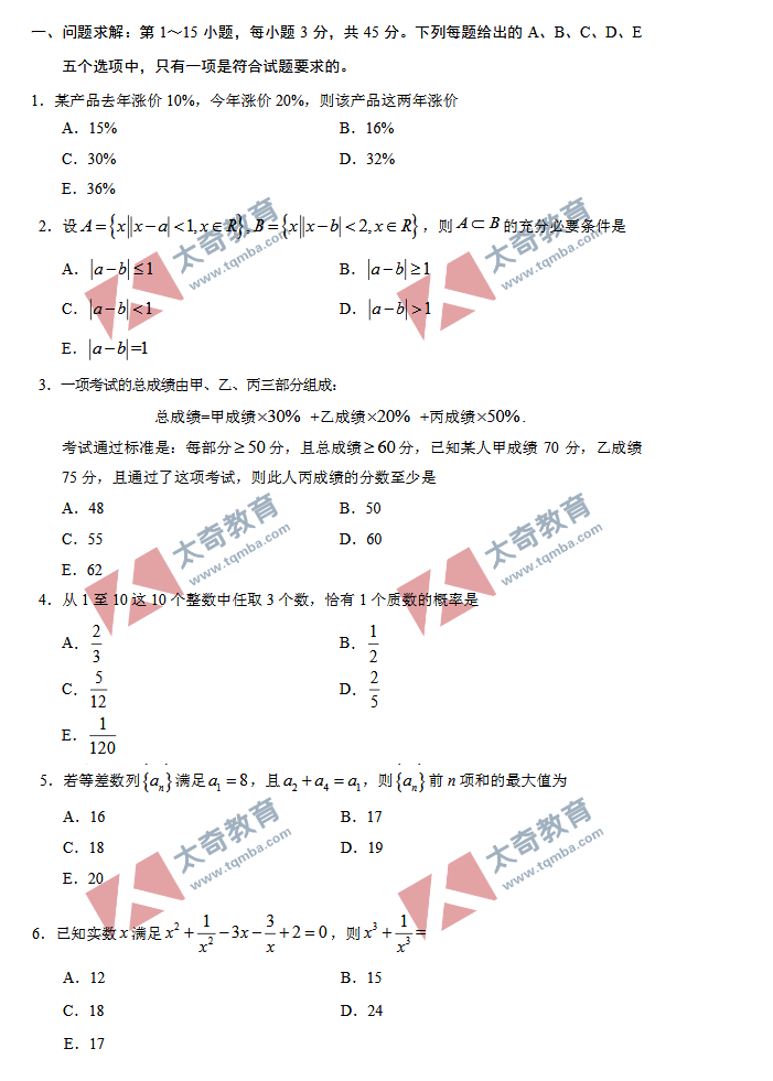 2020年MBA/MEM管理類聯(lián)考數(shù)學真題