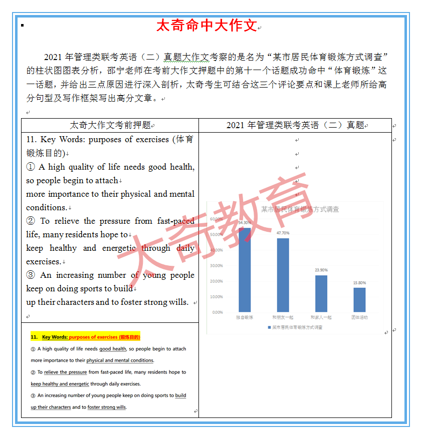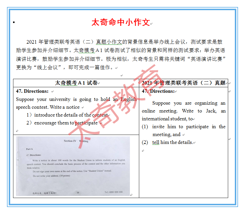 太奇2021年MBA管理類聯(lián)考英語真題命中對照