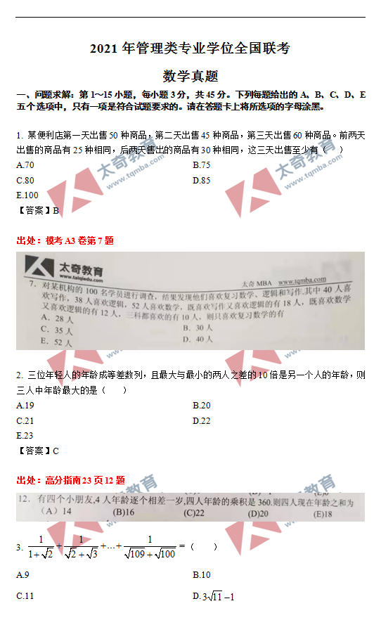 太奇2021年MBA管理類聯(lián)考數(shù)學(xué)真題命中對(duì)照