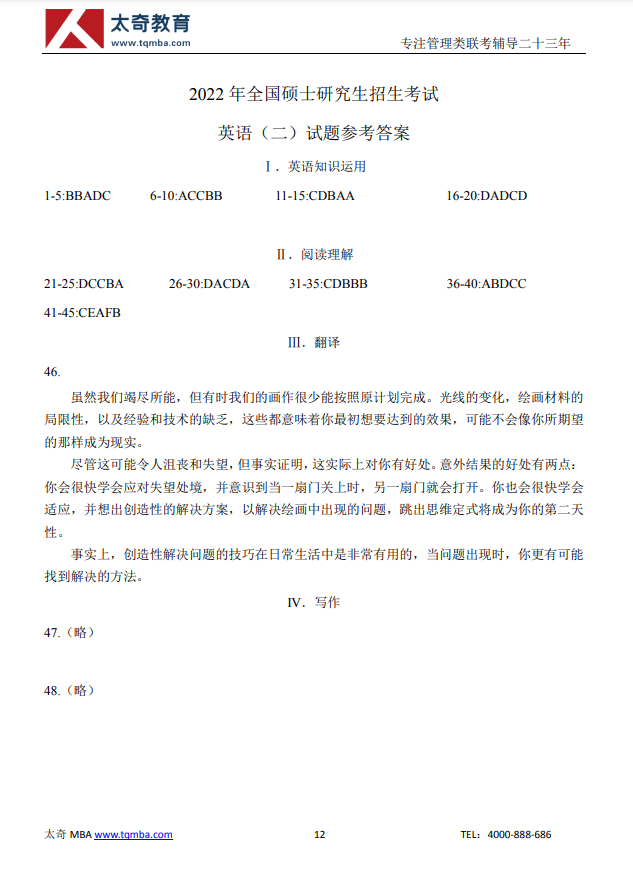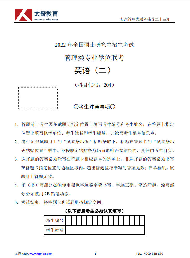 今天太奇小編為大家整理了2022年考研英語(二)真題,考試答案在文章最后,祝大家今年考試順利,考上自己心儀的院校。