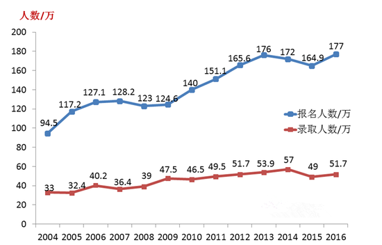 2016年我國碩士研究生報名人數(shù)約為177萬人,比2015年增長約12萬人,增長約7%,打破了自2014年以來的考研人數(shù)兩連降趨勢。同時,2016年全國研究生招生計劃總?cè)藬?shù)為51.72萬人,錄取比例約為29%。2004年至2016年全國考研報名人數(shù)及錄取人數(shù)詳情見下圖。
