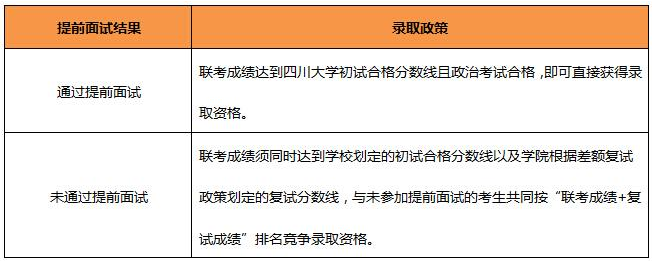 復試包括常規(guī)面試和政治考試,通過提前面試的考生參加政治考試合格則直接獲得錄取資格;未通過提前面試及未參加提前面試的考生參加政治考試合格后按照“聯(lián)考成績+面試成績”排名競爭錄取資格。