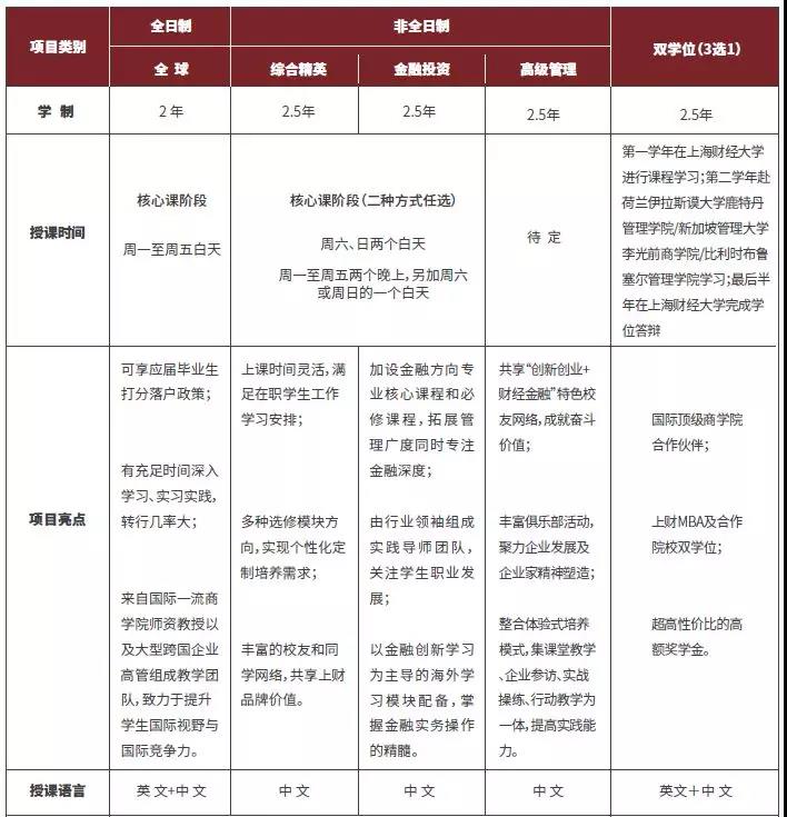 2020年上財(cái)MBA項(xiàng)目設(shè)有全日制-全球班、非全日制-綜合精英班、非全日制-金融投資班、非全日制-EMBA,各項(xiàng)目概況詳見(jiàn)下圖: