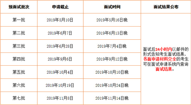 面試安排批次依照考生遞交書(shū)面材料的順序先到者先評(píng)估,先安排預(yù)面試。預(yù)面試內(nèi)容:綜合能力面試(個(gè)面)、英語(yǔ)能力測(cè)試(6到8人一組面試)。面試后我校會(huì)在系統(tǒng)中告知考生的面試成績(jī),即錄取分?jǐn)?shù)線(xiàn)類(lèi)別(A線(xiàn)B線(xiàn)C線(xiàn))。報(bào)考我校一志愿的考生成績(jī)兩年有效,次年可繼續(xù)申請(qǐng)。