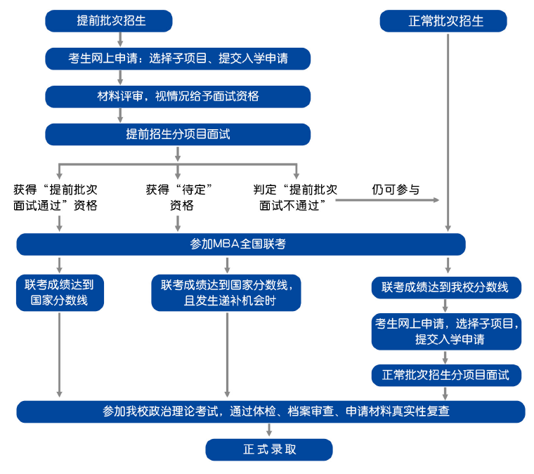 4.“MBA提前批次招生”將安排于2020年6月至10月進(jìn)行,參加提前批次招生的考生需在聯(lián)考報名前的指定期間內(nèi)在線提交申請材料,經(jīng)過材料評審,擇優(yōu)給予面試資格;經(jīng)過面試環(huán)節(jié)擇優(yōu)給予綜合素質(zhì)優(yōu)秀的考生“提前批次面試通過”資格;原則上,該類考生參加全國聯(lián)考成績達(dá)到國家線、符合復(fù)試要求即可附條件錄取。(以當(dāng)年國家政策和學(xué)校要求為準(zhǔn))