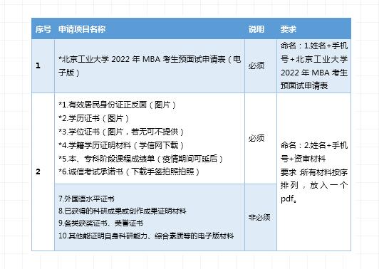 2.申請材料:請將《北京工業(yè)大學(xué)2022年MBA考生預(yù)面試申請表》和資審材料放入同一文件夾(見原文鏈接附件),壓縮打包后發(fā)送,郵件名稱和文件夾名稱為“第x批2022MBA預(yù)面試+姓名+手機(jī)號”。
