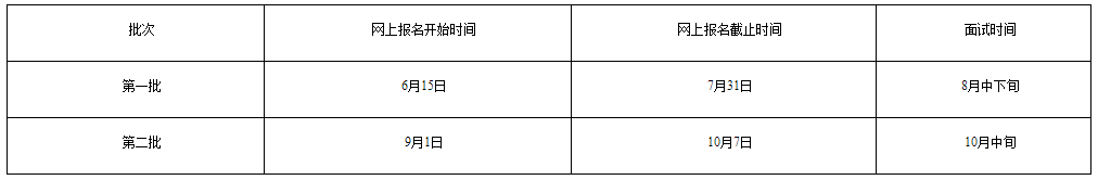 預(yù)計(jì)進(jìn)行2次提前批面試,具體安排見表1(具體報(bào)名時(shí)間段,面試時(shí)間詳見每一批次面試前發(fā)布的具體通知)