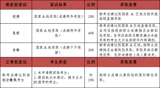 第一,繼續(xù)實(shí)行通過(guò)提前面試按“國(guó)家A線(xiàn)錄取”的招生政策,旨在選拔潛在的投資家、創(chuàng)業(yè)家和高級(jí)職業(yè)經(jīng)理人。提前面試分為優(yōu)秀、良好、合格三個(gè)等級(jí)。