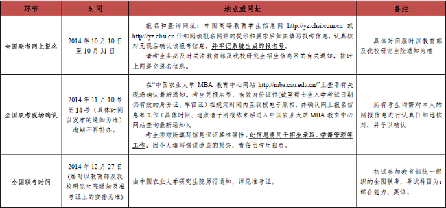 注意:報(bào)考我校MBA的考生必須選擇“中國(guó)農(nóng)業(yè)大學(xué)”為報(bào)考點(diǎn),并于2014年10月10日至10月31日網(wǎng)上報(bào)名期間進(jìn)行網(wǎng)上支付報(bào)名費(fèi),本考點(diǎn)不接收現(xiàn)場(chǎng)交費(fèi)。