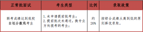 (1)面試資格:聯(lián)考成績(jī)達(dá)到我校自劃線(xiàn)的考生可根據(jù)情況申請(qǐng)正常批面試。正常批次面試名額占錄取總名額的約20%。