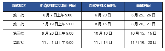 ②填寫和上傳申請材料。網(wǎng)上提交的申請材料包括:申請書、成績單、個人簡歷、單位組織結(jié)構(gòu)圖、推薦信(非必需)。申請材料的具體內(nèi)容和要求見系統(tǒng)內(nèi)說明??忌峤簧暾埐牧蠒r需要選擇申請面試批次,并在所選批次申請材料提交截止日期前提交。各批次的申請截止時間和面試時間見下頁"面試批次"表。