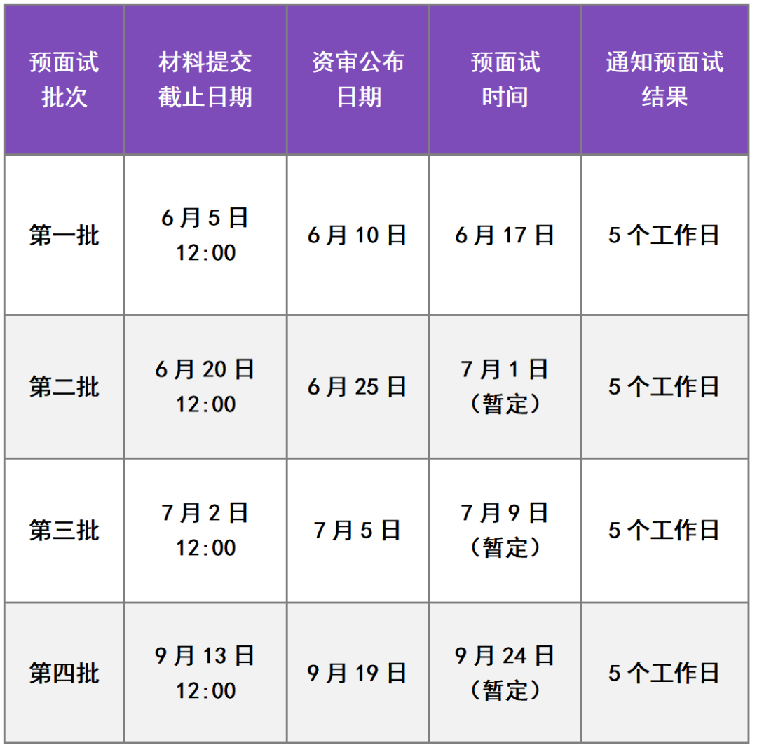 * 除第一批外其余各批次預(yù)面試時(shí)間請(qǐng)以后續(xù)具體通知為準(zhǔn)。預(yù)面試資審結(jié)果、具體安排及預(yù)面試結(jié)果將以郵件形式發(fā)送至面試考生。