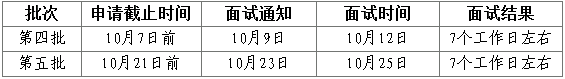 第三批面試網(wǎng)上申請(qǐng)截止日期為9月23日晚零點(diǎn),后續(xù)批次面試安排如下: