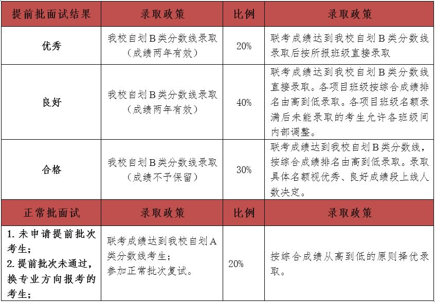 2.提前面試中獲得有條件預(yù)錄取(優(yōu)秀、良好、合格)資格的考生聯(lián)考成績過我校自劃B類分?jǐn)?shù)線且在檔案和申請材料審查真實性通過后,按成績對應(yīng)錄取政策錄??;