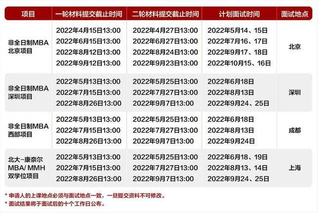 2023年非全日制MBA深圳、西部項目、北大-康奈爾MBA/MMH雙學(xué)位項目的一輪材料提交最終截止時間為2022年8月26日13:00,二輪材料提交最終截止時間為2022年9月7日13:00。