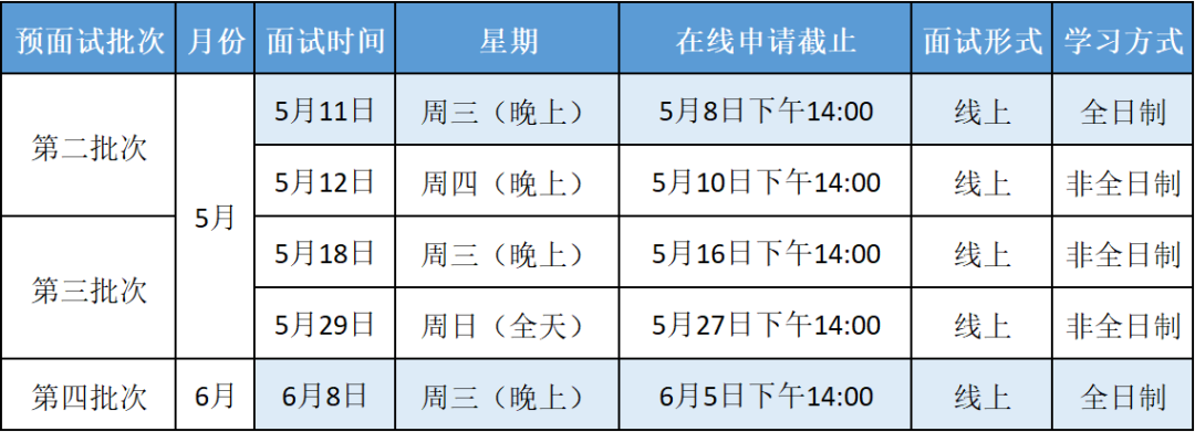 大家好!感謝您申請(qǐng)2023年入學(xué)華東師范大學(xué)MBA項(xiàng)目預(yù)面試?,F(xiàn)階段因處于疫情防控階段,為方便考生,暫定全日制與非全日制預(yù)面試均采用線上形式(具體以郵件通知為準(zhǔn))。5月11日(全日制)預(yù)面試現(xiàn)因人數(shù)已滿,報(bào)名通道已提前自動(dòng)關(guān)閉。現(xiàn)已開啟5月12日、5月18日(非全日制)和6月8日(全日制)預(yù)面試報(bào)名通道(具體詳見下圖,我們會(huì)根據(jù)實(shí)際情況逐步開放后期批次),因每一批次名額有限,人滿系統(tǒng)將提前自動(dòng)關(guān)閉報(bào)名通道。預(yù)面試時(shí)間持續(xù)更新中,請(qǐng)隨時(shí)關(guān)注官方微信公眾號(hào)與官方網(wǎng)站。面試需注意事項(xiàng)將于面試前一周內(nèi)以官方郵件形式發(fā)送至各位考生申請(qǐng)時(shí)預(yù)留郵箱,請(qǐng)注意查收。