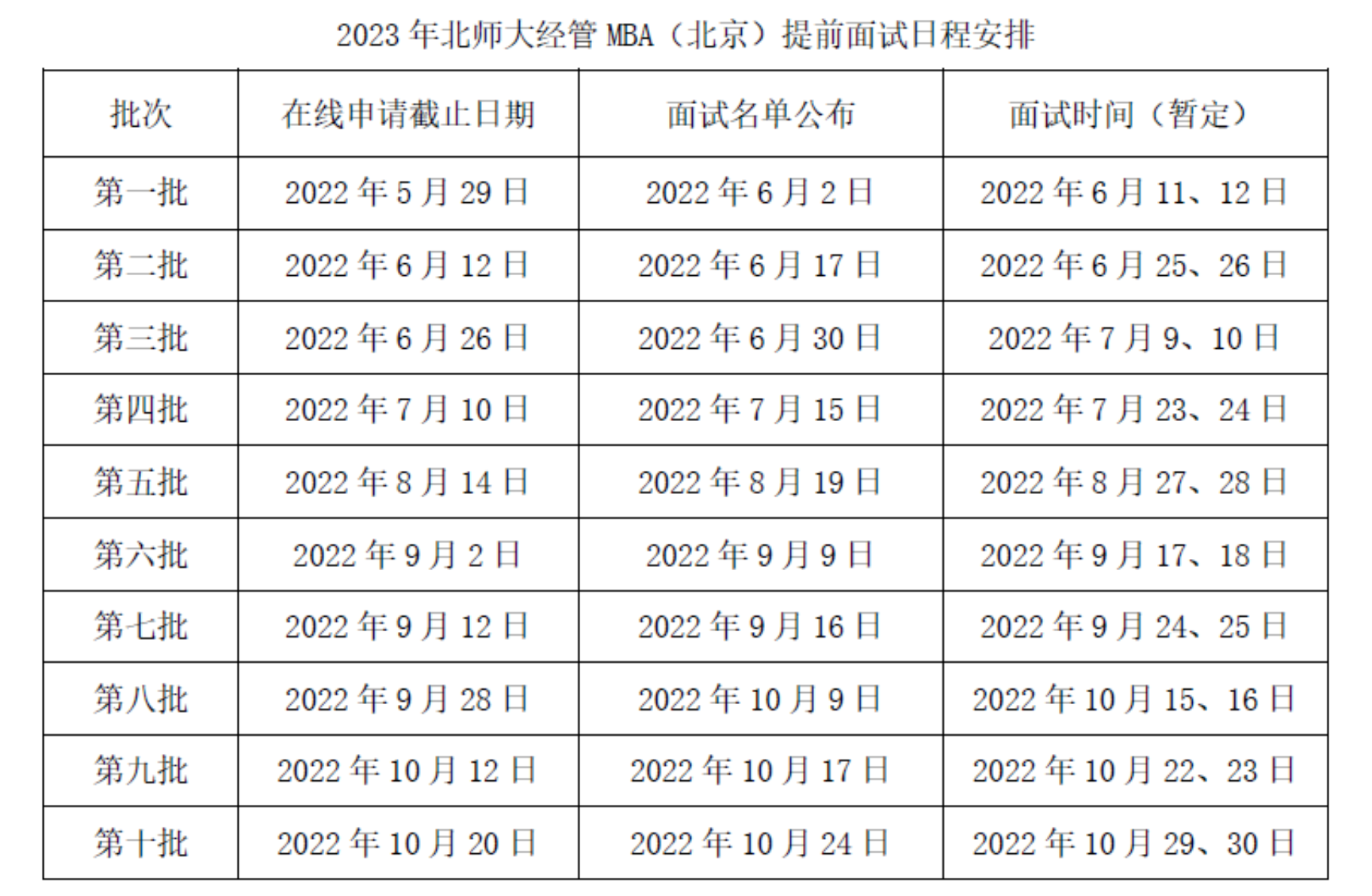 *注:參加過2022年北師大經(jīng)管MBA(北京)提前面試的結(jié)果保留至報(bào)考2023年北師大經(jīng)管MBA(北京)。“2022年北師大經(jīng)管MBA(北京)提前面試”指在2021年舉辦的針對(duì)報(bào)考2022年北師大經(jīng)管MBA(北京)的提前面試。