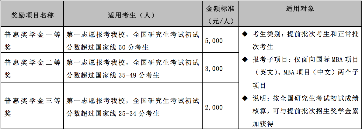 設(shè)立四種類別入學(xué)獎(jiǎng)學(xué)金,以資鼓勵(lì)報(bào)考我校MBA/EMBA項(xiàng)目、全國(guó)研究生考試初試分?jǐn)?shù)成績(jī)優(yōu)秀、提前批次招生面試表現(xiàn)出色的考生。