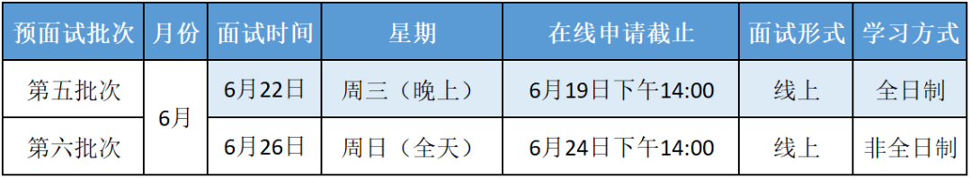 大家好!感謝您申請(qǐng)2023年入學(xué)華東師范大學(xué)MBA項(xiàng)目預(yù)面試?,F(xiàn)階段因處于疫情防控階段,為方便考生,暫定全日制與非全日制預(yù)面試均采用線上形式(具體以郵件通知為準(zhǔn))。預(yù)面試第一、二、三、四批次已結(jié)束,6月15日(非全日制)批次因人數(shù)已滿,報(bào)名通道已提前自動(dòng)關(guān)閉。現(xiàn)已開啟6月22日(全日制)和6月26日(非全日制)預(yù)面試報(bào)名通道(具體詳見下圖,我們會(huì)根據(jù)實(shí)際情況逐步開放后期批次),因每一批次名額有限,人滿系統(tǒng)將提前自動(dòng)關(guān)閉報(bào)名通道。預(yù)面試時(shí)間持續(xù)更新中,請(qǐng)隨時(shí)關(guān)注官方微信公眾號(hào)與官方網(wǎng)站。申請(qǐng)網(wǎng)址:http://mbazs.ecnu.edu.cn/